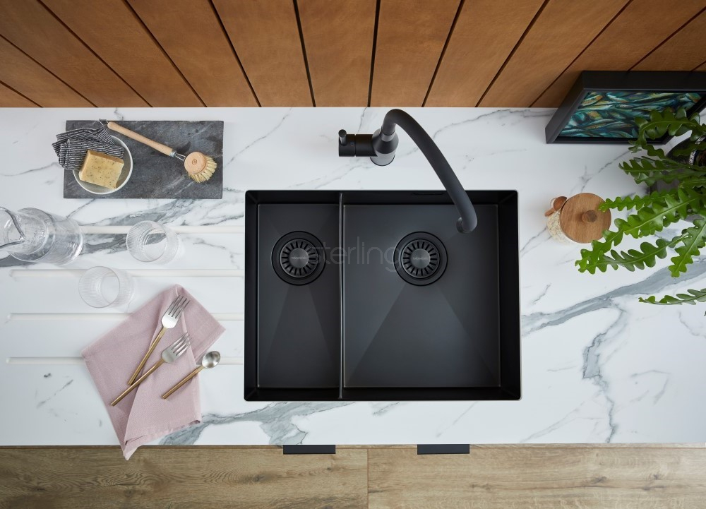 The Volta PVD Black is black - not compromised tones of dark grey that is usually on offer. This pure colour creates a very sophisticated presence in the kitchen and is certainly statement making. The PVD properties add a very resistant surface and the Volta Black has also been treated with Nano technology. This has created a uniquely smooth surface which is not only dirt repellent but is extremely hygienic. This sleek sink has been fabricated in 1.0 steel and have been treated with Silentcote to increase the robustness and add hushed tones when in use. This 1.5B model has a very slim bowl divider adding a very contemporary aesthetic whilst maximising the bowl dimension.