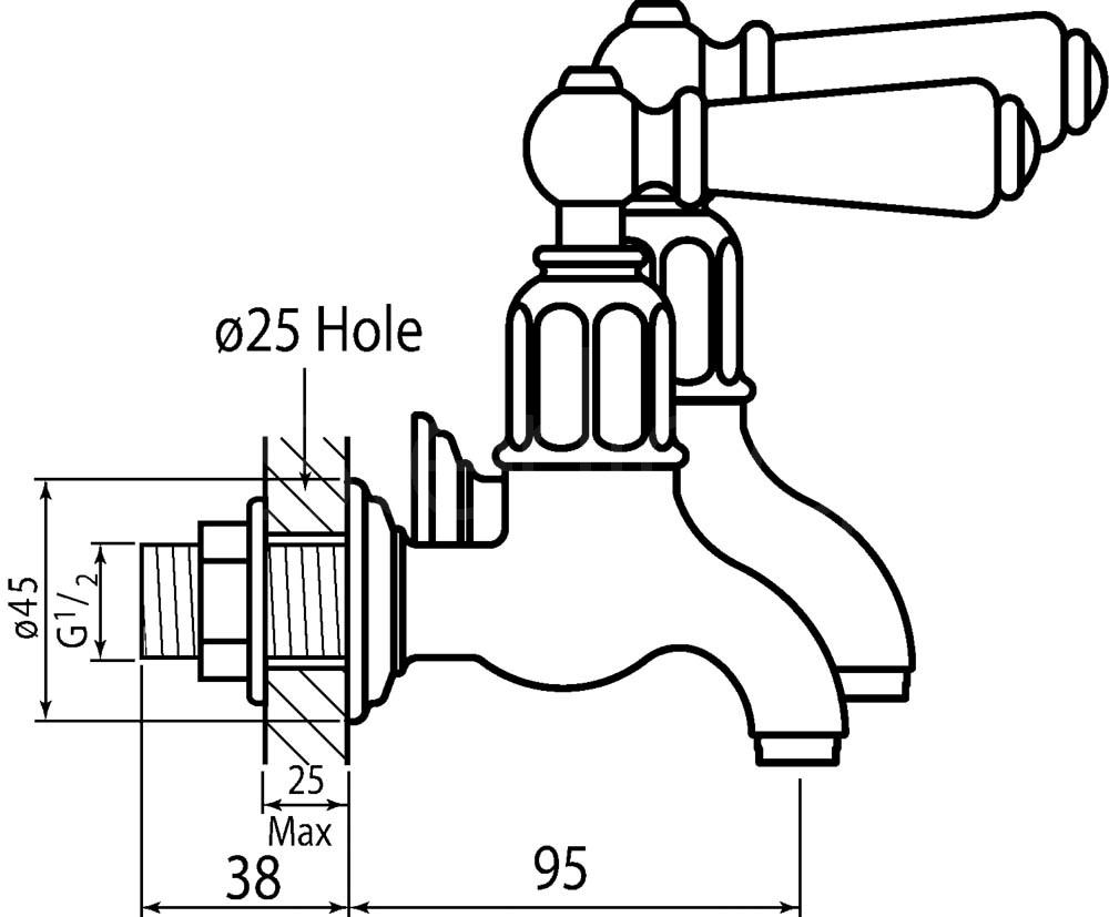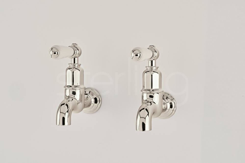 This pair of beautiful Mayan bibcock taps are wall-mounted for a stylish space-saving design, and feature classic porcelain inserts on the lever handles to finish.