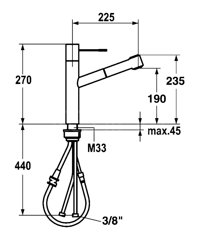 Single-hole, single lever kitchen mixer with swivel spout and pull-out spray. Stainless Steel housing. Flexible supply hoses, 3/8'' compression fittings. Swivel spout 120 degree. Pull-out length 27''. Hermetically sealed, ceramic disc control cartridge - adjustable temperature and flow rate limitation. Mounting hole size diameter: 1-3/8''. Flow rate: 2.2 gpm at 60 psi. Chrome.