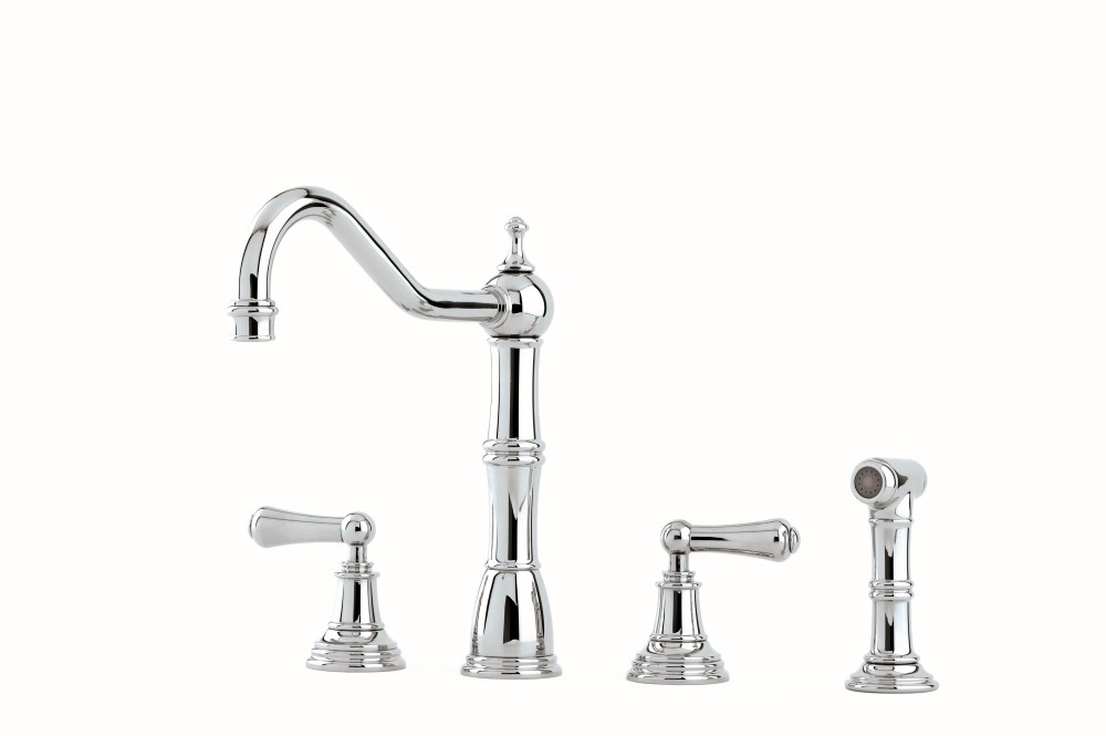 The Provence mixer features a curvaceous spout and detailed design work - an elegant addition to country or traditional-style kitchens. This version includes beautiful lever handles, and also a handy side spray rinse for help when cooking, cleaning and filling large pots and pans.