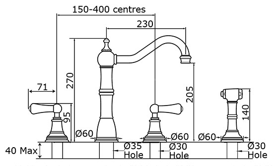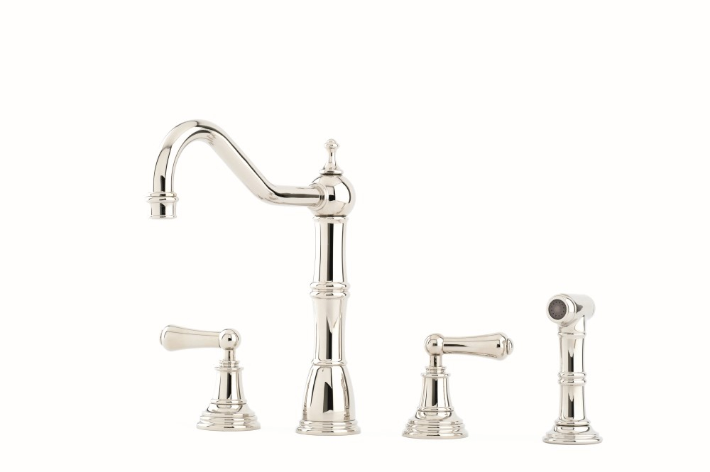 The Provence mixer features a curvaceous spout and detailed design work - an elegant addition to country or traditional-style kitchens. This version includes beautiful lever handles, and also a handy side spray rinse for help when cooking, cleaning and filling large pots and pans.