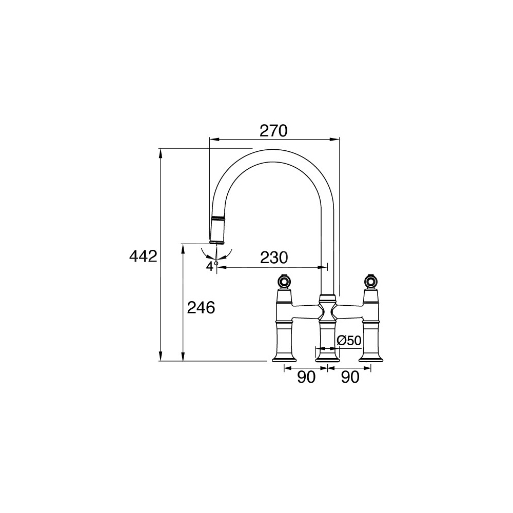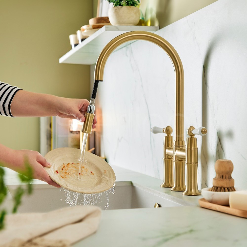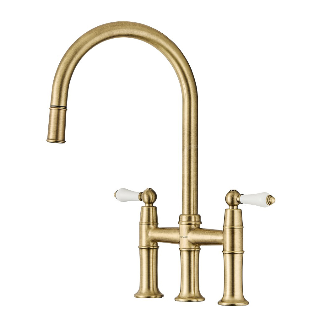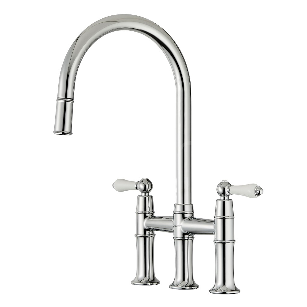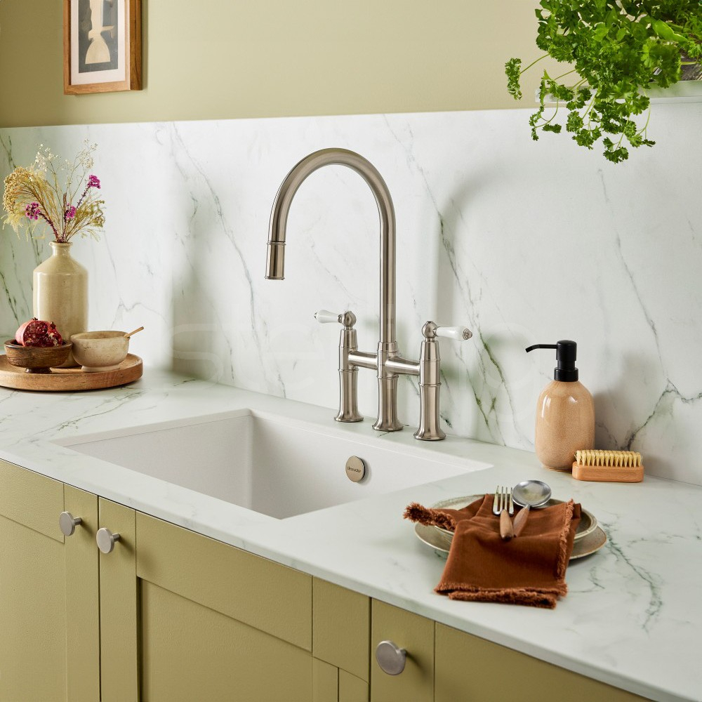 The Elegance Bridge Pull-Out unites timeless Victorian character with advanced modern performance. Designed for traditional and farmhouse kitchens, this refined three-hole bridge mixer features elegant ceramic lever controls and a tall, graceful swivel spout. A discreetly integrated pull-out rinse adds exceptional flexibility, extending the tap’s functionality without compromising its period styling.