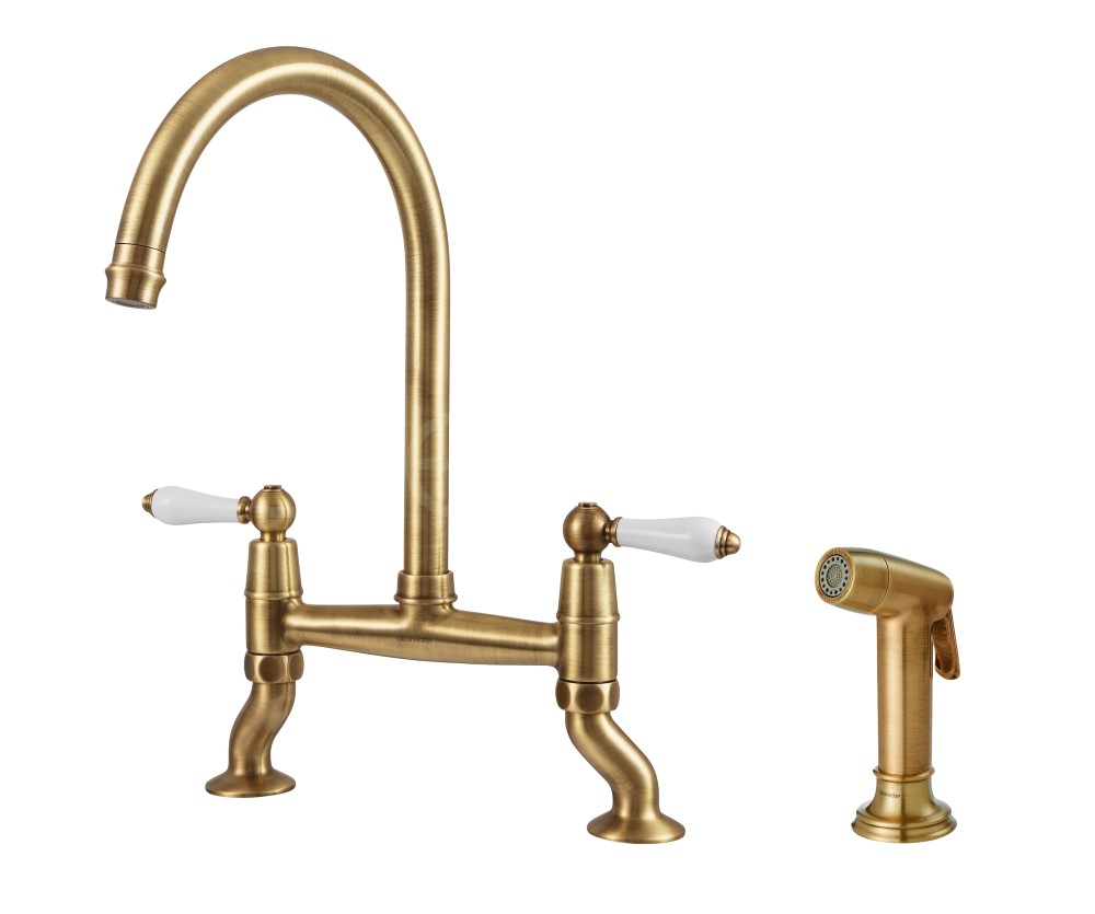 The Elegance Bridge & Pull-out spray provide Victorian elegance with 21st Century spec. This classic tap with its unique Twist & Spray function is teamed up with a twin flow side-spay gretaly increasing its task abilities. Available in 5 fantastic finishes; Brushed Brass, Brushed Copper, Brushed Nickel, Brushed Bronze & Chrome