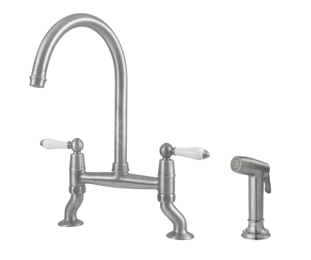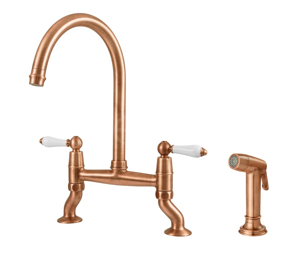 The Elegance Bridge & Pull-out spray provide Victorian elegance with 21st Century spec. This classic tap with its unique Twist & Spray function is teamed up with a twin flow side-spay gretaly increasing its task abilities. Available in 5 fantastic finishes; Brushed Brass, Brushed Copper, Brushed Nickel, Brushed Bronze & Chrome