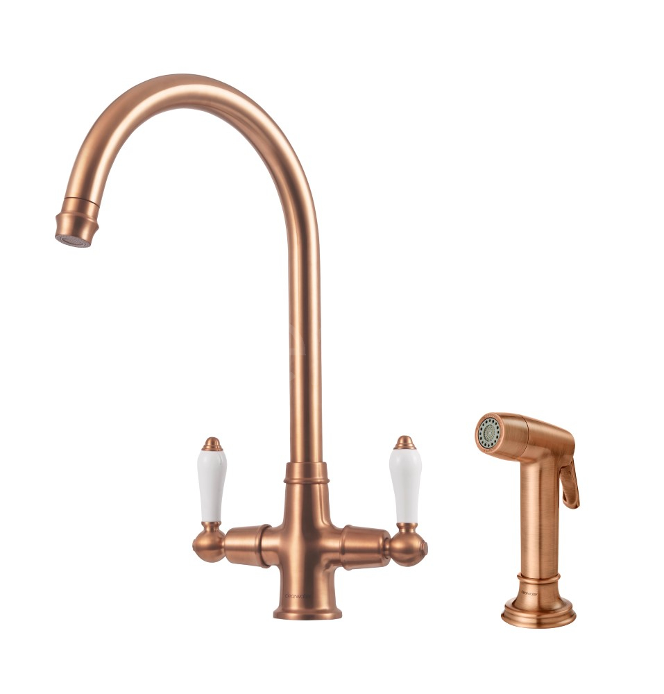 Traditionally styled Elegance & pull-out spray combine to provide Semi-pro tap abilities with a unique Twist & Spray function and a matching side-spray with a smooth auto-retract movement. Available in 5 fantastic finishes; Brushed Brass, Brushed Copper, Brushed Nickel, Brushed Bronze & Chrome