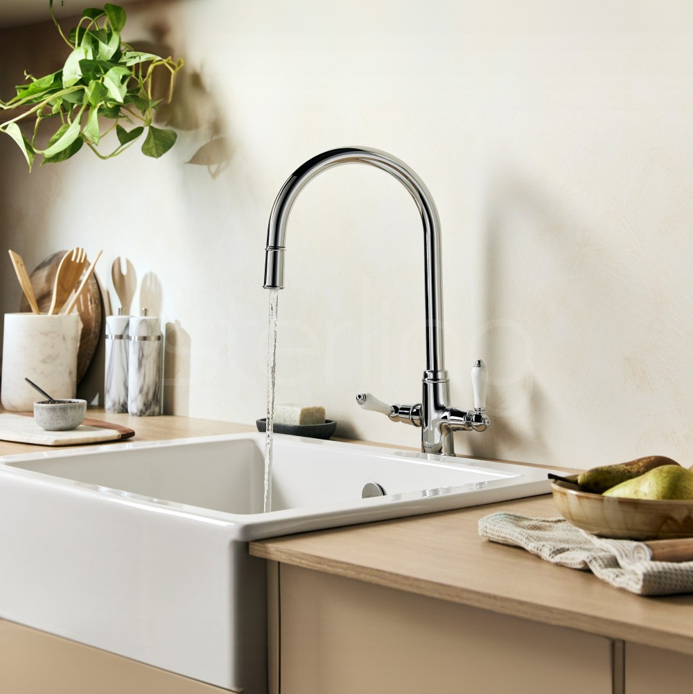 Behind its graceful, heritage-inspired form lies a hidden pull-out rinse handset, extending up to 40cm to dramatically increase reach and usability. Ideal for rinsing vegetables, filling large pans, or cleaning deep ceramic sinks, the pull-out feature operates smoothly and quietly thanks to Clearwater’s ClearGlide super-soft hose system.