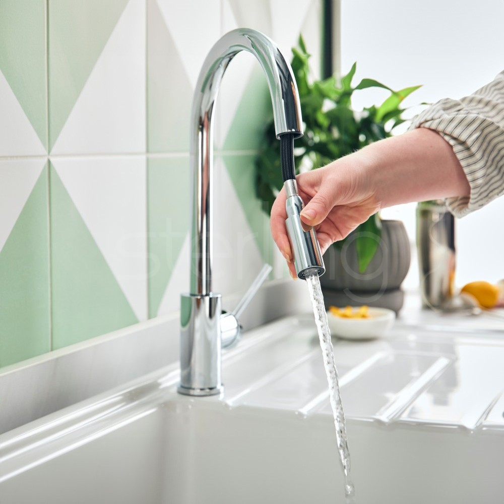 Featuring an interchangeable twin-spray head, you can switch effortlessly between a soft aerated flow and a powerful needle-jet spray — ideal for rinsing, filling, and generating detergent foam with ease. The pull-out handset extends up to 40 cm and is supported by the ClearGlide super-soft PEX hose for ultra-smooth and quiet operation.