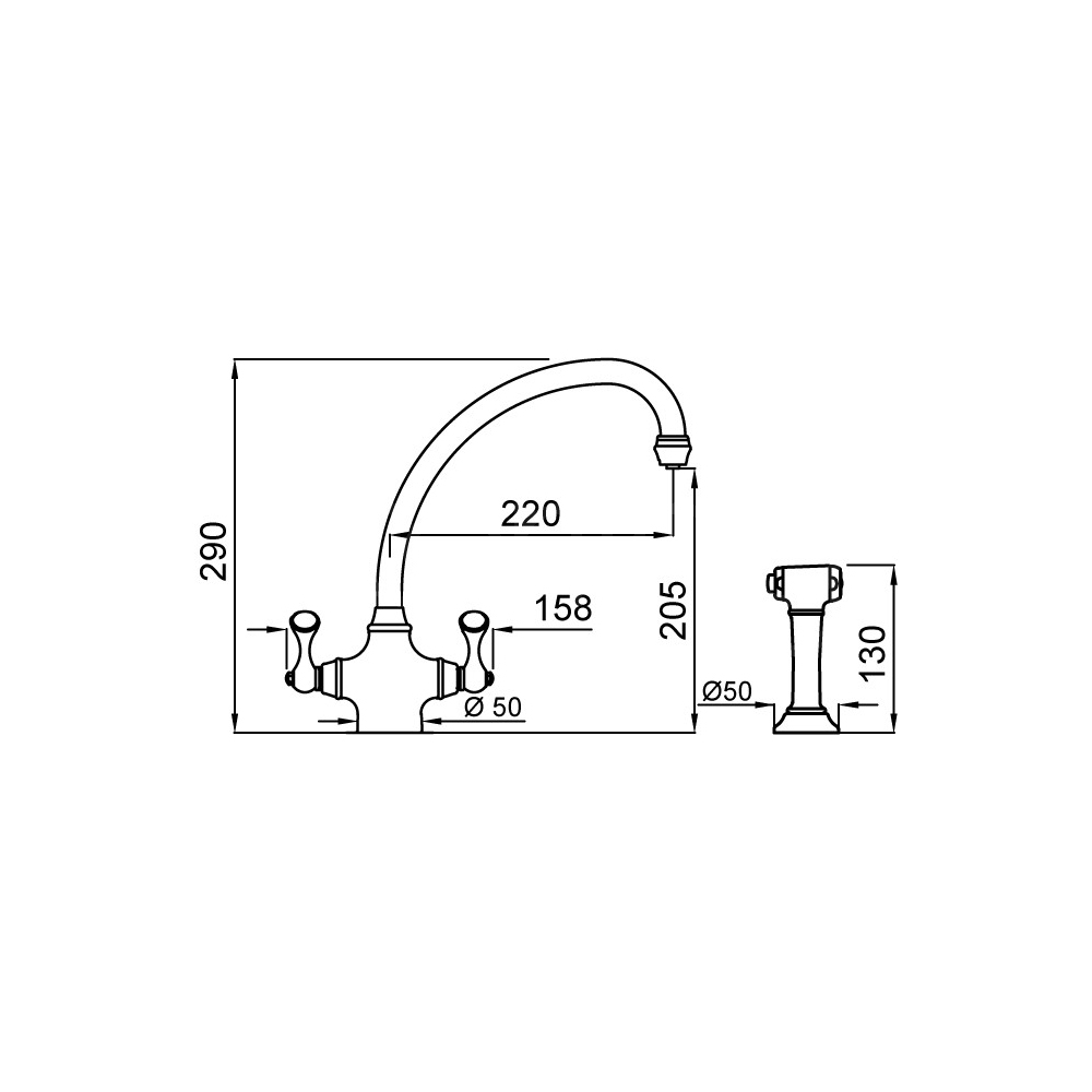 The Etruscan is traditional in style, featuring a distinctive spout and 'Hot' and 'Cold' ceramic indices on lever handles. This version comes with a side spray rinse.