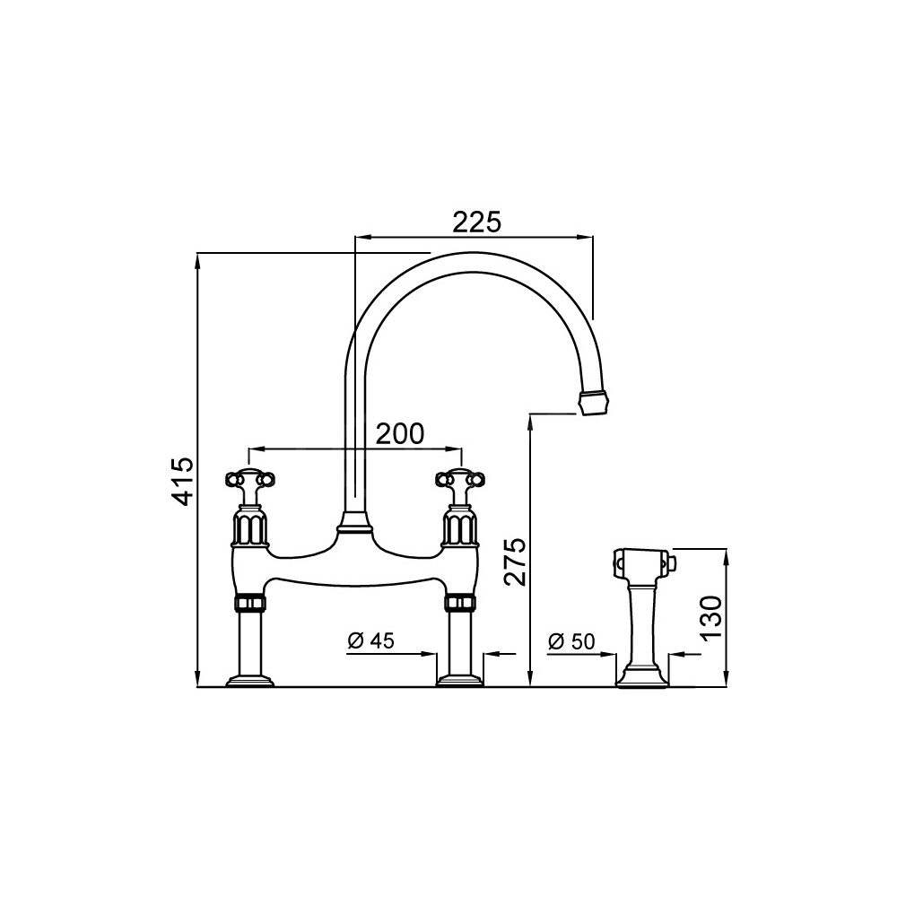 The classic bridge mixer and an iconic Perrin & Rowe tap, the Ionian deck-mounted bridge mixer is very much at home in both traditional and contemporary kitchens. This version features beautiful 'Hot' and 'Cold' ceramic indices on the crosstop handles as well as a useful side spray rinse for help in the kitchen with cooking, cleaning and filling large pots and pans.