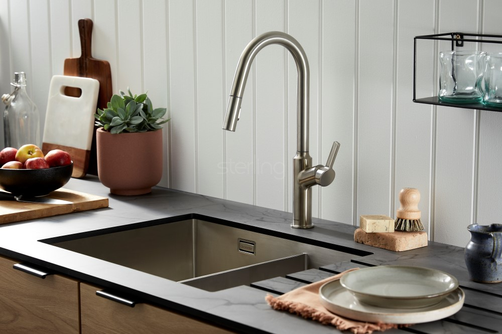 The Karuma's sophisticated slimline design is complemented by the latest crank spout design. This ultra-modern mixer offers latest tech operation, including silky smooth pull-out spout with the added benefit of twin-flow options for multi-tasking. Available in 4 finishes; Chrome, Brushed Nickel, Brushed Brass & Matt Black. - PVD Coating; helps to with-stand surface damage Nano technology provides a more hygienic surface. - Two-Function Spray-Head; Button allows you to switch from aerated flow to needle jet spray - ideal for rinsing down and generating detergent foam. - Energy saving cold-start control