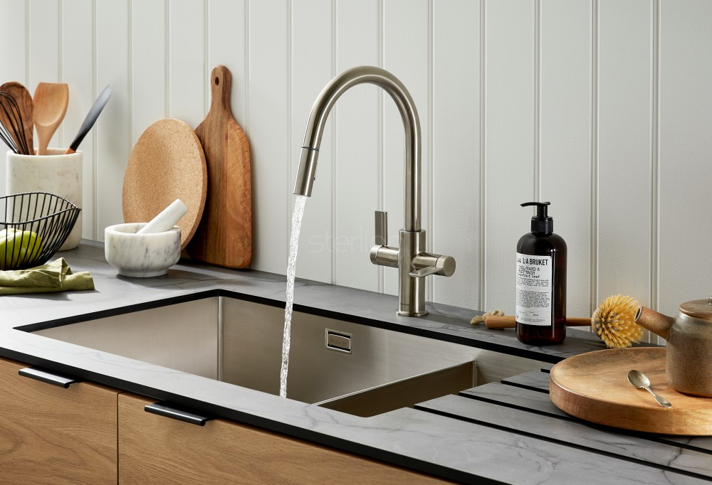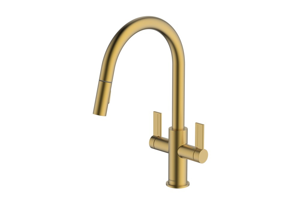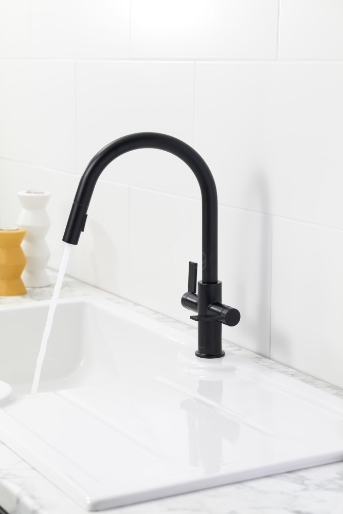 The Kira C-Spout Pull-Out Clearwater Kitchen Tap brings minimalist modern design and practical performance to the heart of your kitchen. Its refined, contemporary aesthetic is paired with easy-to-operate high-set twin lever controls, providing smooth and precise adjustment of water flow and temperature.