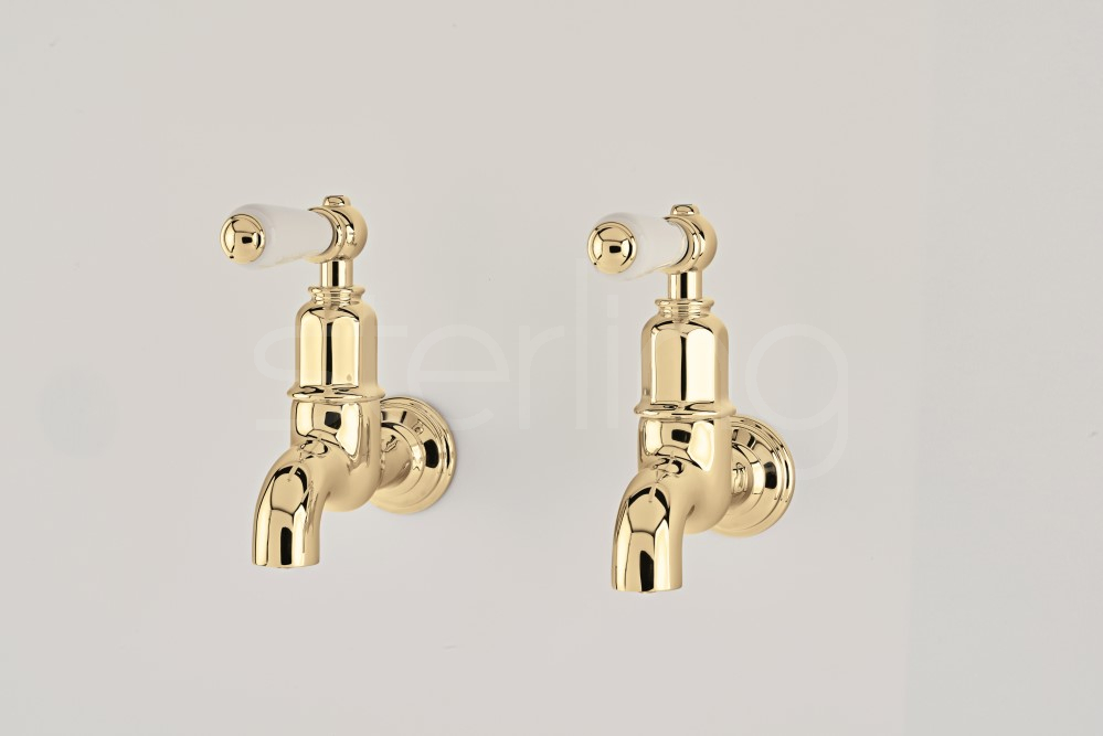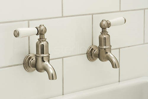 This pair of beautiful Mayan bibcock taps are wall-mounted for a stylish space-saving design, and feature classic porcelain inserts on the lever handles to finish.