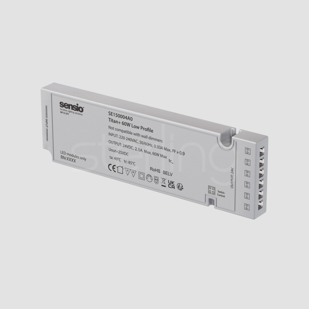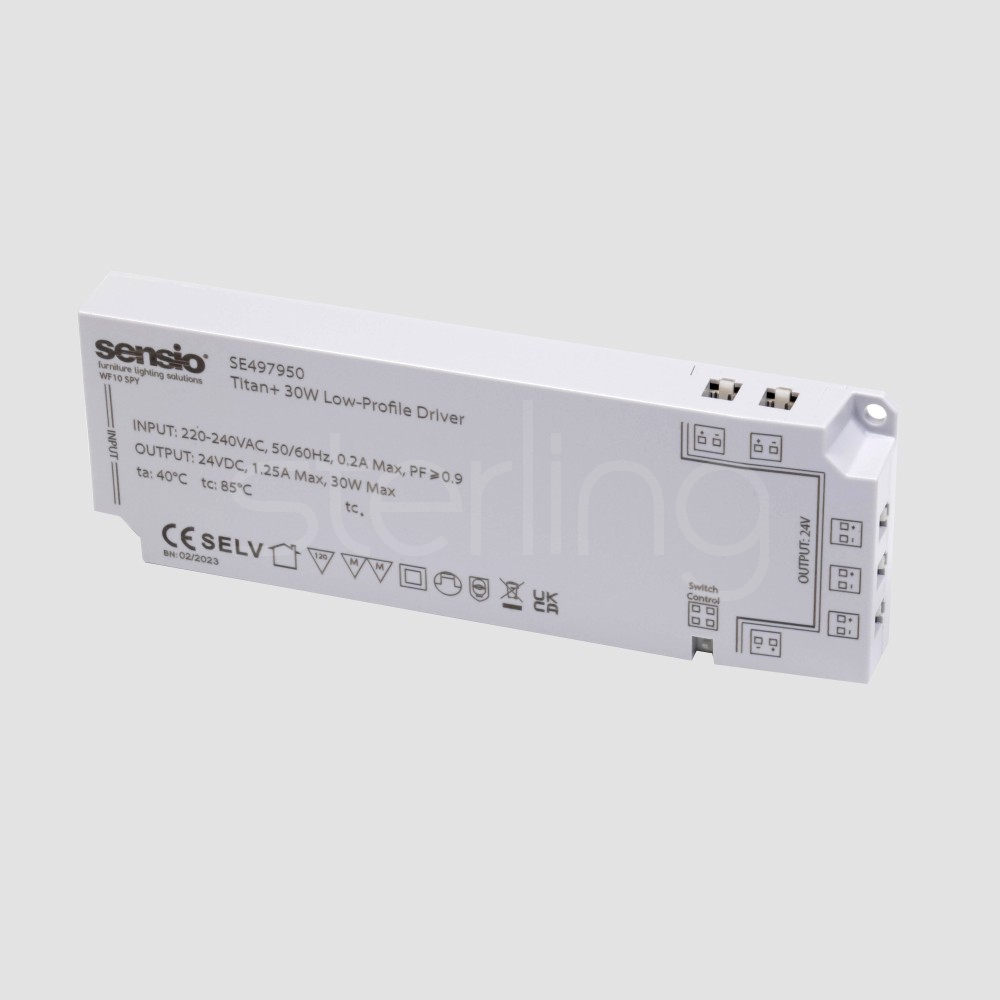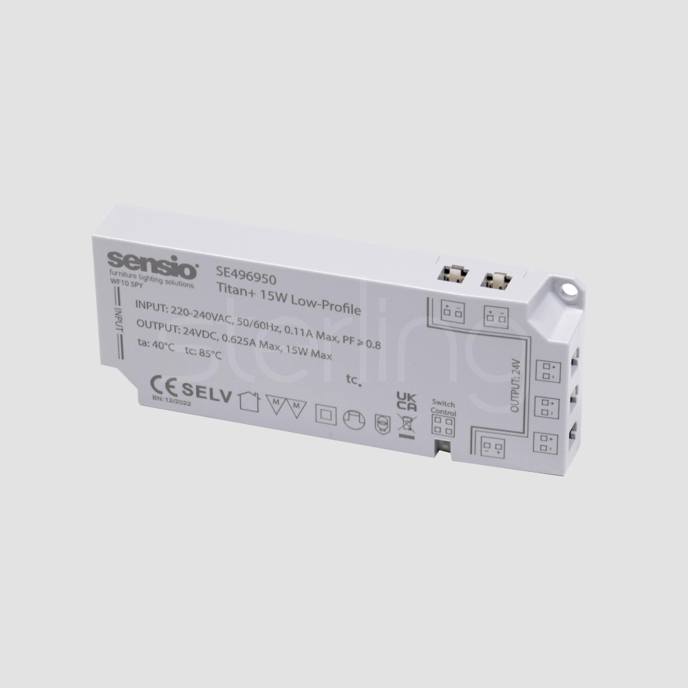 The Titan+ Driver is a slim, low-profile LED driver designed to safely power Sensio lighting systems while offering flexible control options. Converting mains voltage to a stable 24V output, it features integrated 2-pin distribution ports for quick, plug-and-play connection of multiple lights. A dedicated sensor port allows compatibility with PIR, IR, door, and switch sensors, enabling easy control without the need for complex wiring. Its compact design makes it ideal for concealed installation within cabinetry, while built-in protection features ensure safe and reliable operation.