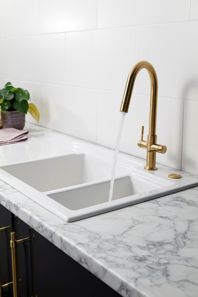 The needle-jet spray is ideal for rinsing plates, preparing food, or generating detergent bubbles more effectively than standard aerators—particularly beneficial with today’s water-regulated systems. This feature significantly expands the tap’s everyday versatility in one simple, intuitive movement. Alternatively, if you have low pressure the tap includes a Laminar high flow aerator for optimum flow performance on a medium-pressure system (0.5 bar).