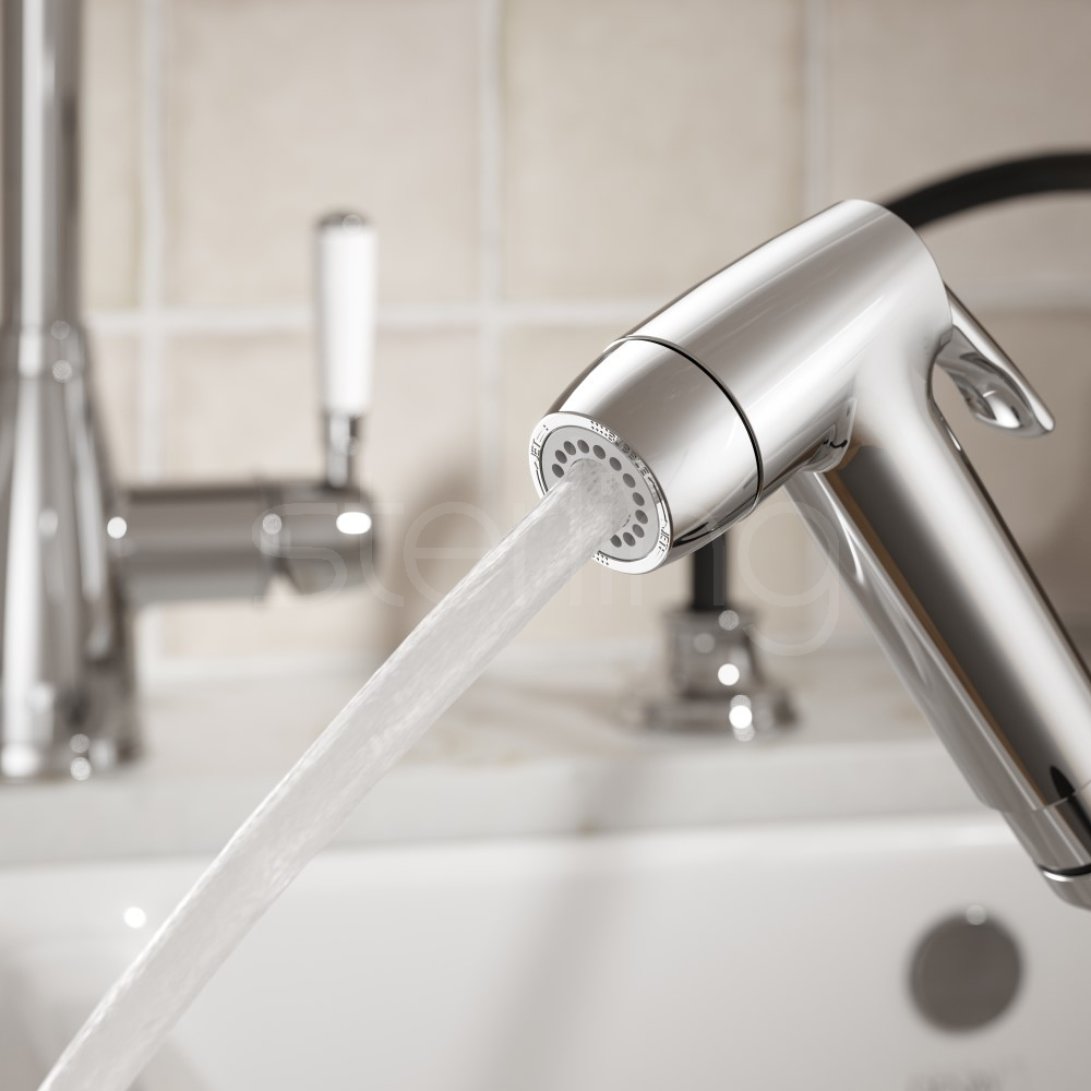 There are two flow types at cold mains pressure: Aerated - ideal for vessel filling and gentle rinsing of delicate food. Needle-jet - for rinsing the crockery prior to the dishwasher, food preparation - washing salads and rice etc and rinsing around the sink bowl and drainer after use.