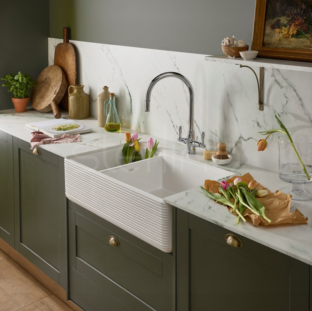 Make a bold statement at the heart of your kitchen with the Theocsbury, a striking ceramic Butler sink defined by its distinctive fine-ribbed apron front and beautifully balanced proportions. Handcrafted in Britain as part of the British Classics collection, this sink blends timeless design with modern-day practicality.