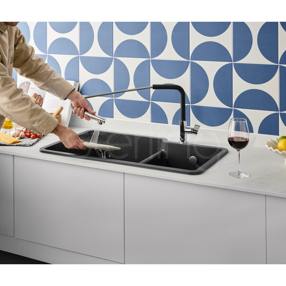 The distinctive black accent detailing adds a subtle design feature, making the tap an ideal choice for coordinating with modern kitchen finishes and colour schemes.