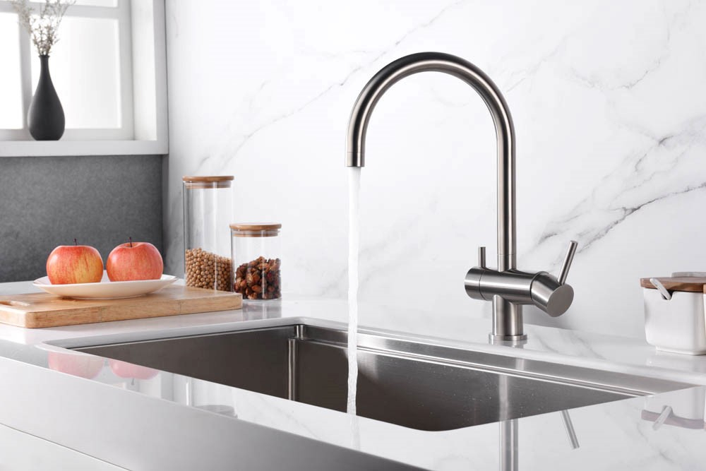 Crafted from high-quality stainless steel, the Aquarius tap boasts a sleek, brushed finish that complements contemporary kitchen aesthetics. The C-shaped swivel spout offers 360° rotation, providing flexibility and ease of use, while the non-pull-out design maintains a clean and streamlined appearance.