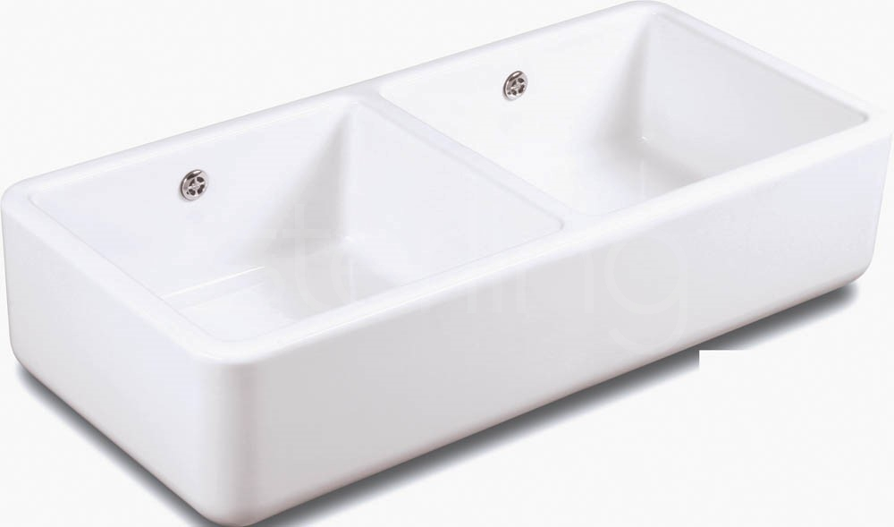 A contemporary apron front double bowl with generous bowl dimensions.