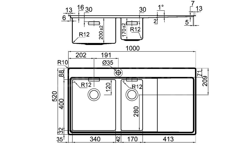 • Main bowl size: 340 x 400 x 200mm / Half bowl size: 170 x 400 x 170mm